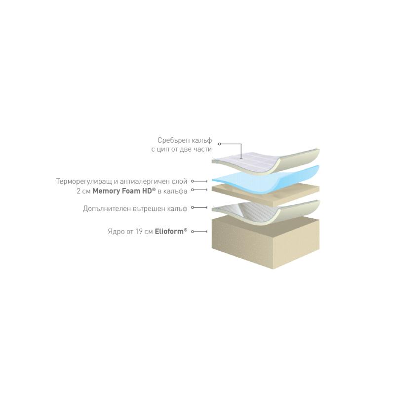 Silvercare е умерено твърд матрак със слой мемори пяна за по-меко усещане и антиалергичен текстил със сребърни влакна.