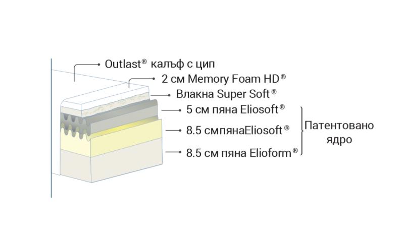 - Memory Foam HD в ядрото и текстила за равномерно разпределение на тежестта и съвършен комфорт