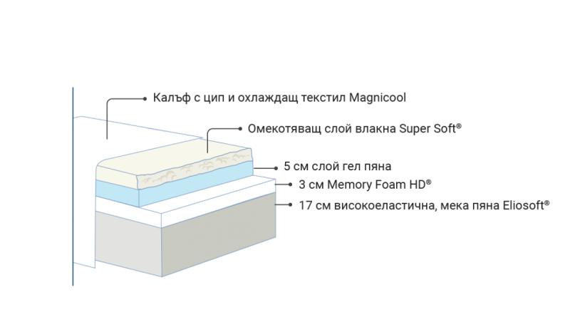 MagniCool e мек матрак, съчетаващ гел пяна и мемори пяна, заедно с иновативен, охлаждащ текстил Magnicool. Текстилът е със специален силикатен материал, който улавя топлината и доставя нежно, хладно усещане. Регулира температурата, като по този начин позволява на тялото да се отпусне по-бързо и предотвратява претоплянето и изпотяването през нощта. Текстилът е дишащ, не задържа влага и топлина.