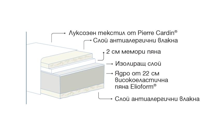 Paradiso by Pierre Cardin е твърд матрак, който съчетава ядро от високоеластична пяна Elioform и допълнителен слой мемори пяна, заедно със слоеве меки влакна.