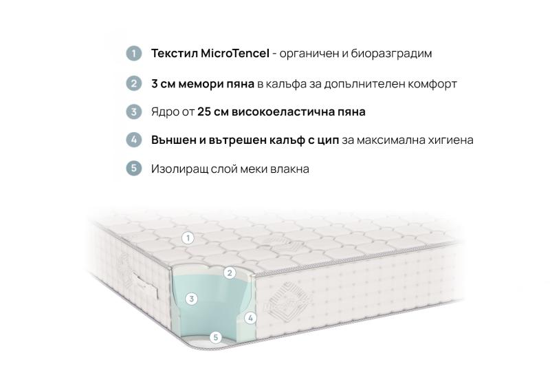 Текстилът на матрака е MicroTencel. Има натурални антибактериални, антиалергични и антиакарни свойства, поема излишната топлина от тялото и гарантира прохладен и спокоен сън. Материалът е 100% органичен и биоразградим.