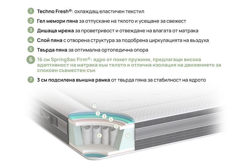 Ядрото е от 16 см индивидуално опаковани покет пружини SpringSac Firm, които се адаптират към извивките на тялото с отлична изолация на движението за спокоен съвместен сън. Стабилизиращата рамка от 3 см пяна с висока плътност предотвратява деформацията на матрака, удължава неговия живот и увеличава площта за сън - комфортно можеш да легнеш дори и близо до ръба на матрака.