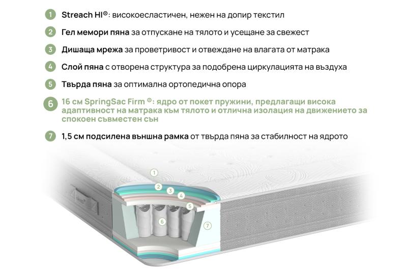 Ядрото е от 16 см индивидуално опаковани покет пружини SpringSac Firm, които се адаптират към извивките на тялото с отлична изолация на движението за спокоен съвместен сън. Стабилизиращата рамка от 1,5 см пяна с висока плътност предотвратява деформацията на матрака, удължава неговия живот и увеличава площта за сън - комфортно можеш да легнеш дори и близо до ръба на матрака.