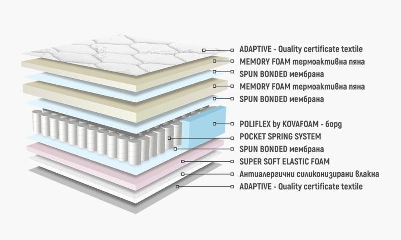 MEMORY FOAM ТЕРМОАКТИВНА ПЯНА | СИСТЕМА ОТ ПОКЕТ ПРУЖИНИ | ПЕНОПОЛИУРЕТАНОВА ПЯНА | ВИСОКОКАЧЕСТВЕН СЕРТИФИЦИРАН ТЕКСТИЛ |