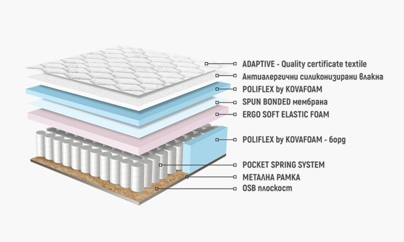 МЕТАЛНА РАМКА | OSB ПЛОСКОСТ | СИСТЕМА ОТ ПОКЕТ ПРУЖИНИ | ПЕНОПОЛИУРЕТАНОВА ПЯНА | ВИСОКОКАЧЕСТВЕН СЕРТИФИЦИРАН ТЕКСТИЛ |