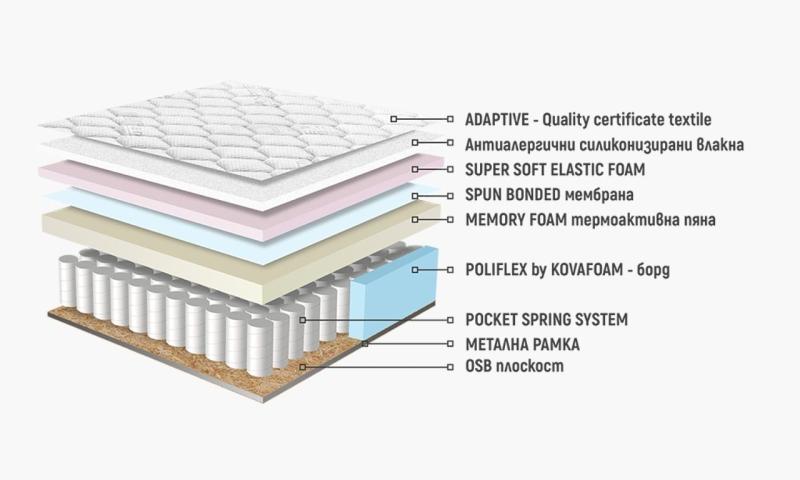 МЕТАЛНА РАМКА | MEMORY FOAM ТЕРМОАКТИВНА ПЯНА | OSB ПЛОСКОСТ | СИСТЕМА ОТ ПОКЕТ ПРУЖИНИ | ПЕНОПОЛИУРЕТАНОВА ПЯНА | ВИСОКОКАЧЕСТВЕН СЕРТИФИЦИРАН ТЕКСТИЛ |