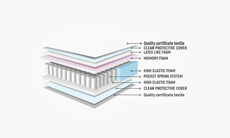 Материалите са с микроклетъчна отворена структура, осъществяваща перфектна проветривост и в дълбочина. Калъф с цип с омекотен ефект, благодарение на висококачествения SOFTENING текстил.