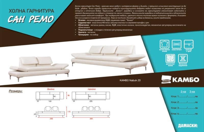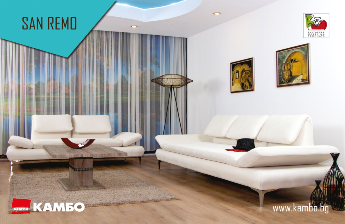 Холна гарнитура Сан Ремо - красива мека мебел с интересна форма и дизайн, с прецизно изчислена конструкция за да бъде удобна. Точно поради правилния подход в конструкцията добрата мебел позволява на умореното тяло да се отпусне и отпочине добре. Пружините „Бонел”, вградени в основата на гарнитурата омекотяват седалката и правят движенията на сядане и ставане по-лесни и плавни. Механизмите вградени в подлакътниците и облегалките увеличават нейният комфорт. При модерните мебели, цветът е точно толкова важен колкото и формата. А когато те са в синхрон е повече от прекрасно. Това се постига с богатият избор на дамаски, които предлагаме.