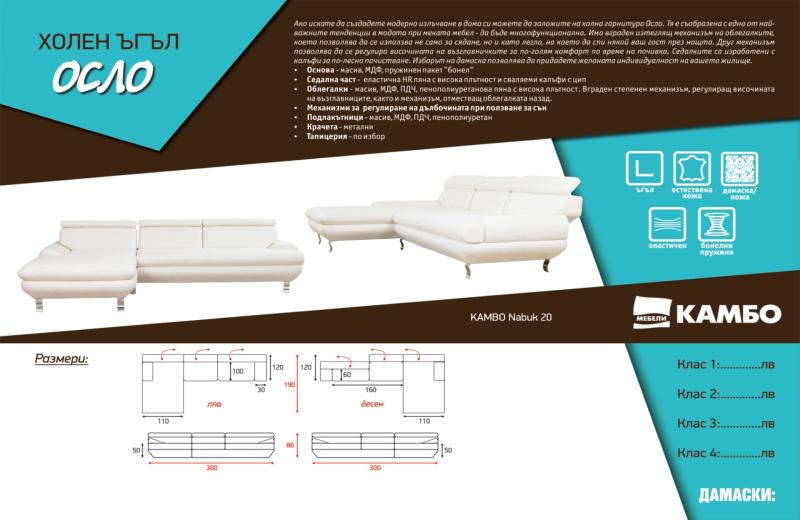 Ако искате да създадете модерно излъчване в дома си можете да заложите на холна гарнитура Осло. Тя е съобразена с една от най-важните тенденции в модата при меката мебел - да бъде многофункционална. Има вграден изтеглящ механизъм на облегалките, което позволява да се използва не само за сядане, но и като легло, на което да спи някой ваш гост през нощта. Друг механизъм позволява да се регулира височината на възглавничките за по-голям комфорт по време на почивка. Седалките са изработени с калъфи за по-лесно почистване. Изборът на дамаска позволява да придадете желаната индивидуалност на вашето жилище.