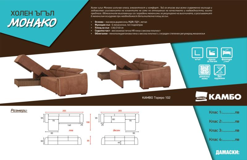 Холен ъгъл Монако излъчва класа, елегантност и комфорт. Той се вписва във всяко съвременно жилище и задоволява изискванията на клиентите не само по отношение на качеството и надеждността, които предлага. Облегалните възглавници са с вградени механизми за регулиране на височината, а разгъваемият G механизъм осигурява при необходимост допълнителна площ за сън.