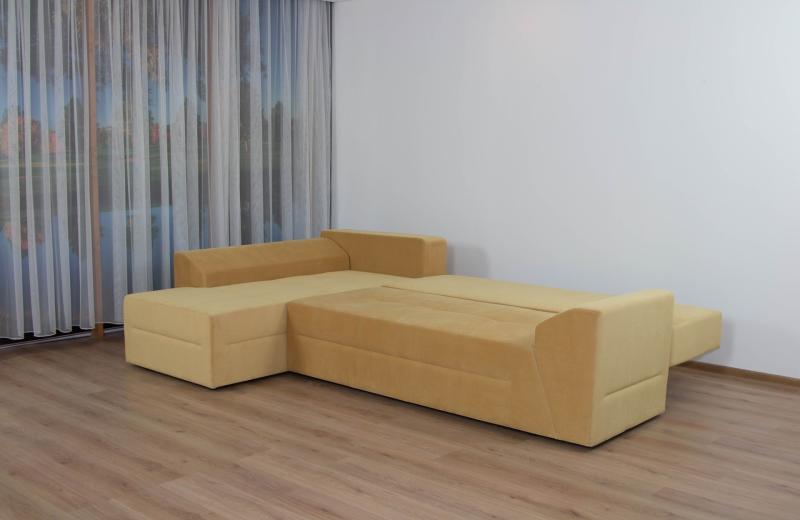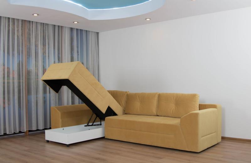 Лежанка - зиг-заг пружина, пружинен пакет тип "Pocket", пенополиуретан с висока плътност, повдигащ механизъм, разкриващ ламинирана ракла за багаж.