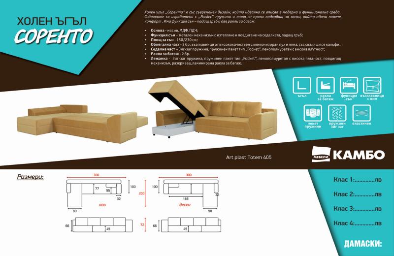 Холен ъгъл „Соренто“ е със съвременен дизайн, който идеално се вписва в модерна и функционална среда. Седалките са изработени със „Pocket” пружини и това го прави подходящ за всеки, който обича повече комфорт. Има функция сън – падащ гръб и две ракли за багаж.