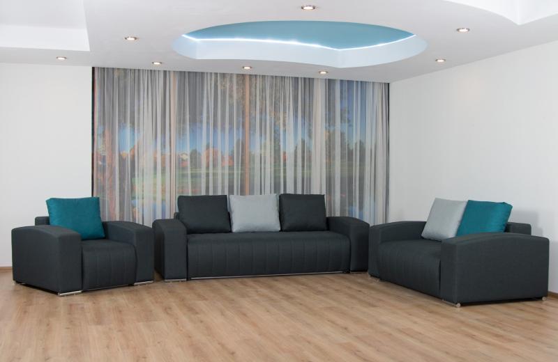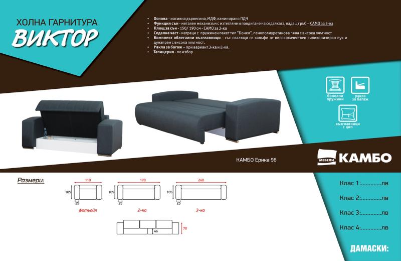 Холна гарнитура Виктор е с атрактивен силует и дизайн, изключително подходяща за както за малки така и за големи жилища. Има опция сън и две ракли за багаж, което я прави практична, комфортна и удобна. Предлага се с дамаска по каталог в широка гама.