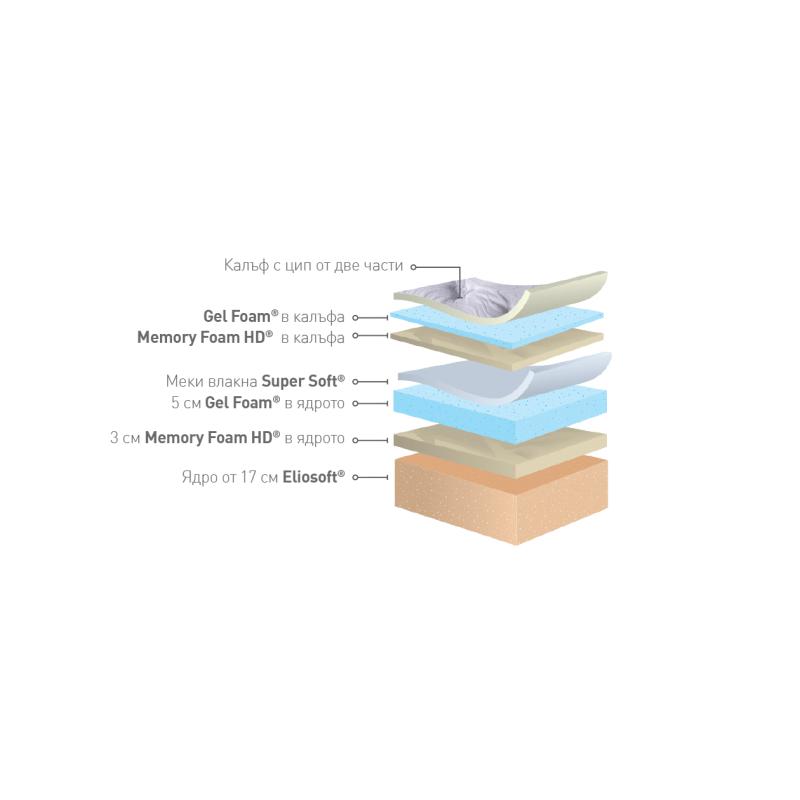 - Memory Foam HD в ядрото и текстила за равномерно разпределение на тежестта и съвършен комфорт