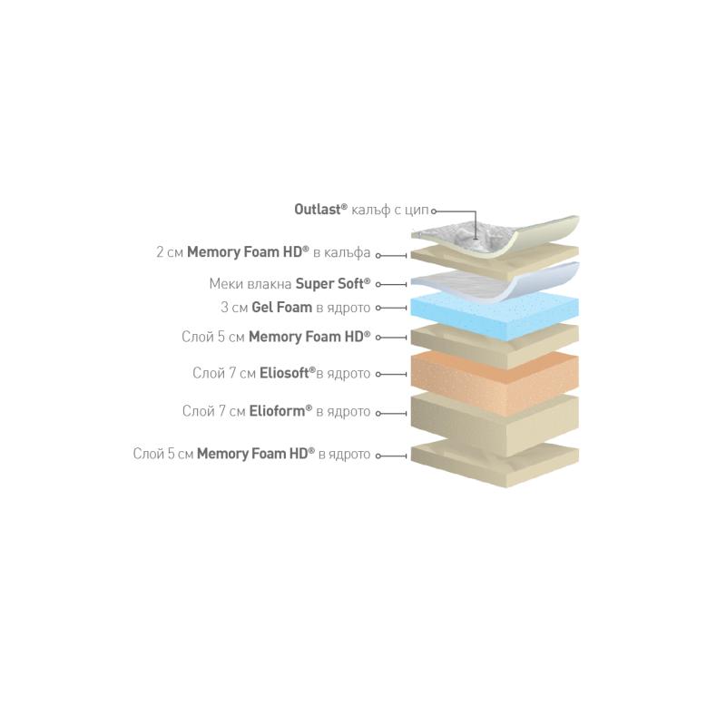 - Два слоя Memory Foam HD в ядрото и един слой в текстила за равномерно разпределение тежестта и съвършен комфорт